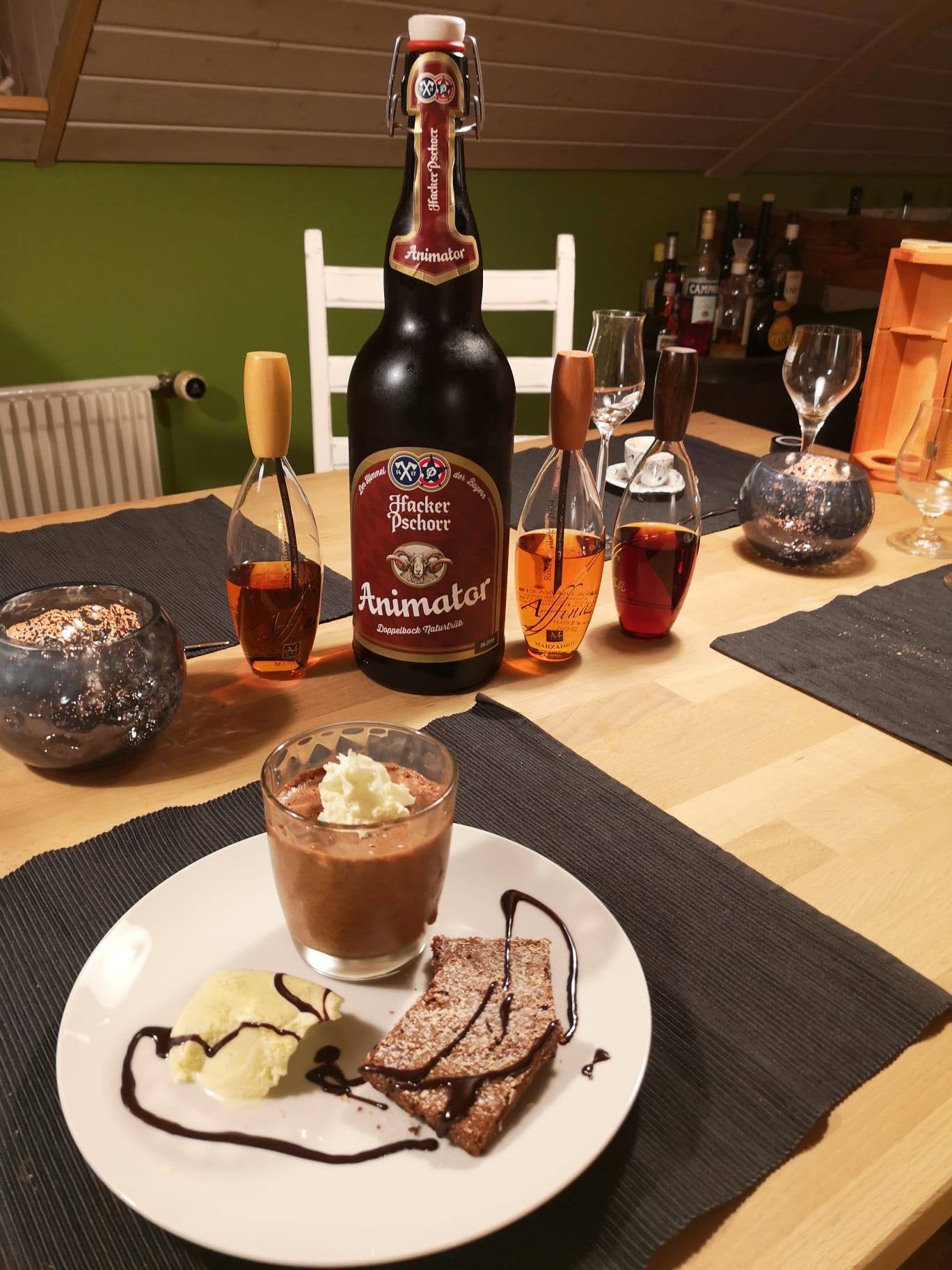 Für das Mousse die Schokolade mit der Butter in einer Schüssel über dem Wasserbad schmelzen, danach das Guinness beifügen und gut verrühren. Sobald alles cremig ist, die Schlüssel vom Wasserbad nehmen und etwas abkühlen lassen.