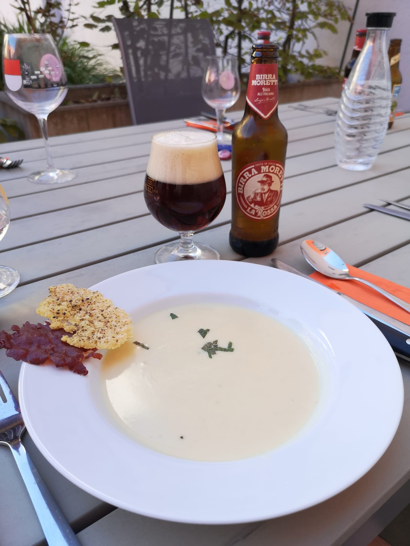 Tipp: Besonders schön ist eine essbare Dekoration, zum Beispiel Parmesan Chips. Frische gehackte Kräuter wie Basilikum sind auch sehr dekorativ.