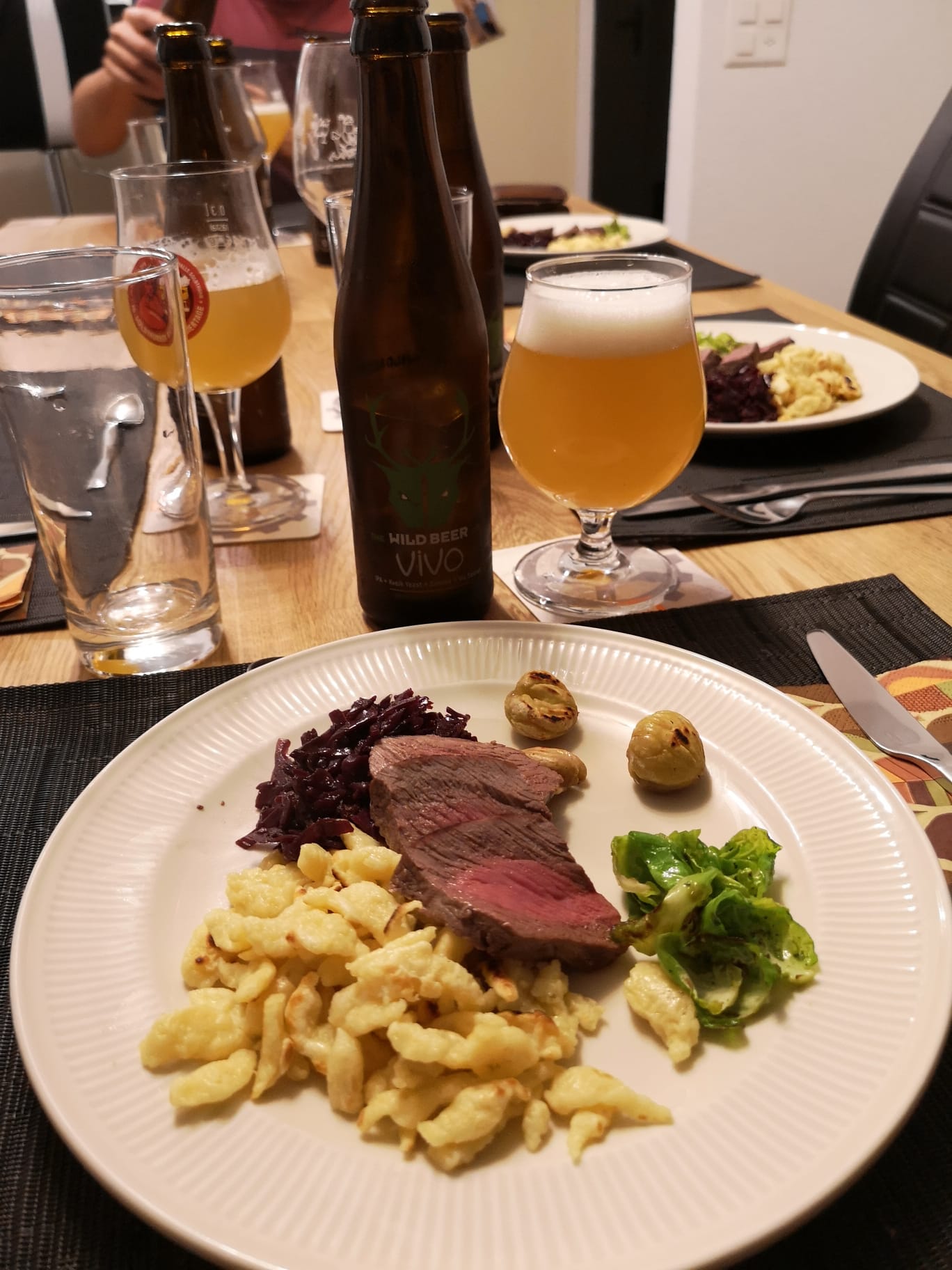 Hirsch Entrecôte mit Knöpfli, Rotkraut und Rosenkohl